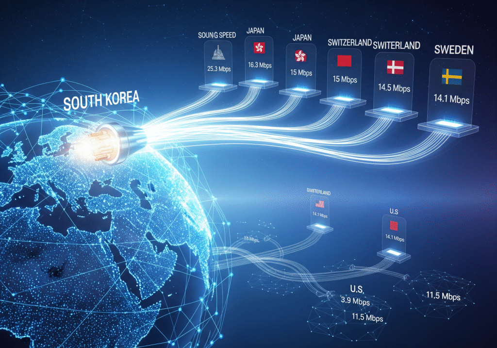 তালিকার এক নম্বরে আরেক এশিয়ার দেশ দক্ষিণ কোরিয়া। গড় গতিতে অন্য সবার চেয়ে বহুদূর এগিয়ে গেছে তারা। ২৫.৩ এমবিপিএস! এখানকার কিছু জায়গায় মাত্র ২০ ডলারে (১৫০০ টাকা) পাবেন ১ জিবিপিএস সংযোগ।
